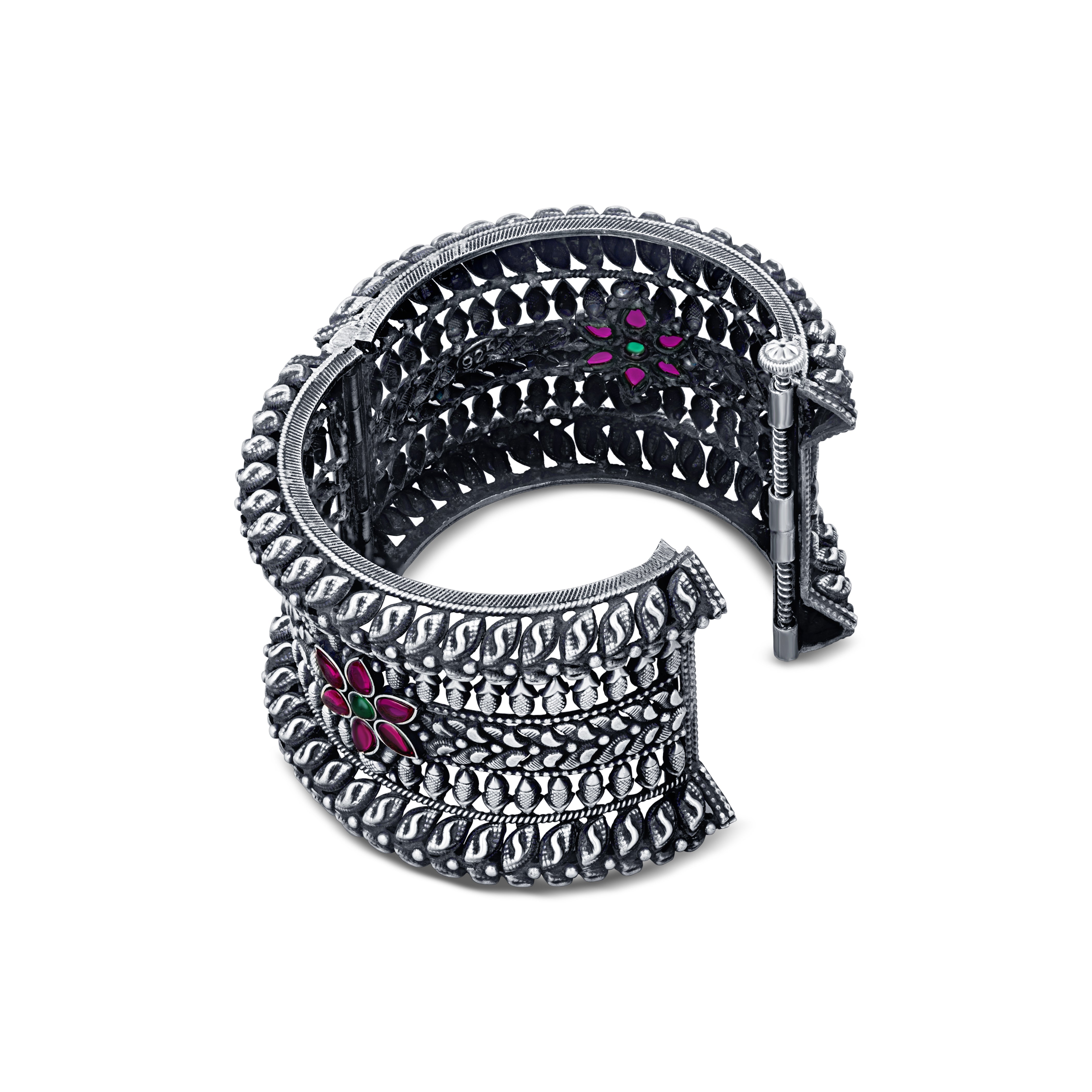 This timeless 92.5 sterling silver Kada in antique finish will grab all the spotlight for you. The antique finish cuff with intricate design from nature is embellished with ruby and emerald.
